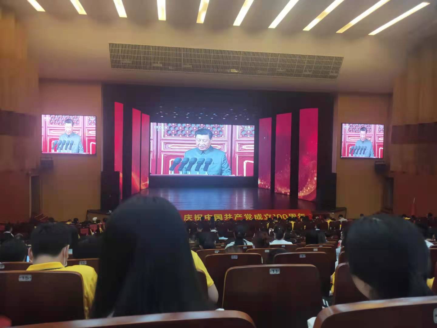 学子同其他28个学院党员、入党积极分子一同前往思源礼堂观看“庆祝中国共产党成立100周年大会”直播。大家认真聆听习近平总书记在大会上所作的重要讲话,回顾建党百年发展历程,用心体会中国共产党百年来筚路蓝缕、百折不挠、勇往直前的光辉历史,坚定为中国人民谋幸福、为中华民族谋复兴的初心使命,为伟大祖国的发展强大感到无比自豪,为实现中华民族伟大复兴的光明前景充满信心。