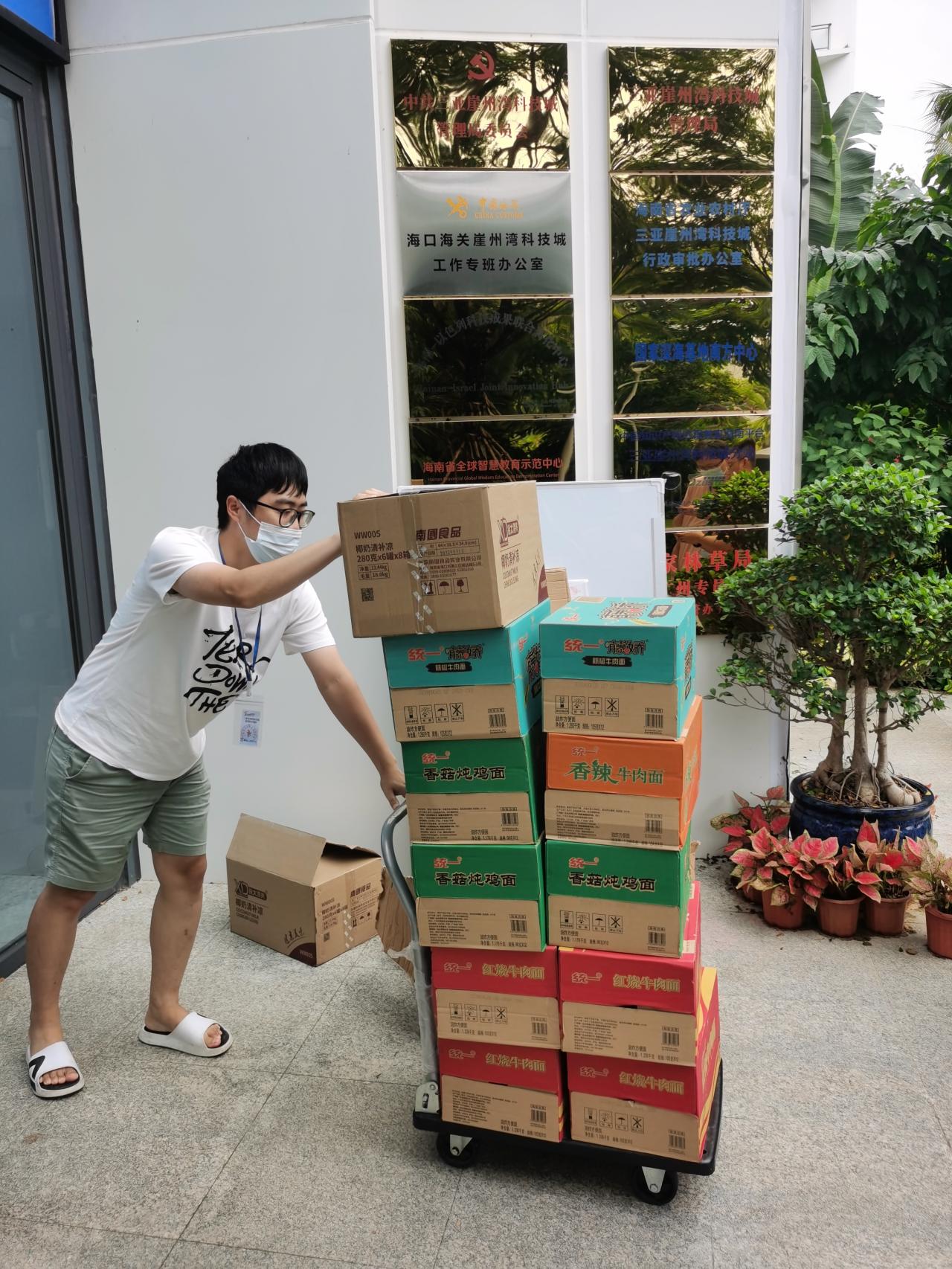 梁丰研老师积极向单位请缨,申请通行证,担任师生物资的保障员和协调员,几乎每天都会统计师生们的盒饭、药品、生活用品等物资的采购需求,并为大家一一配送。由于学生及老师的静态管理地点较为分散,需求也是多种多样,梁老师从无怨言尽量满足学生们的需求,“只要同学们健康、开心,我多跑几趟没关系”。梁老师为了让大家的饮食尽可能丰富,他会在小区物资群里为大家抢购蔬菜包、水果包,并联系了多个线上线下渠道进行采购,确保物资充沛。