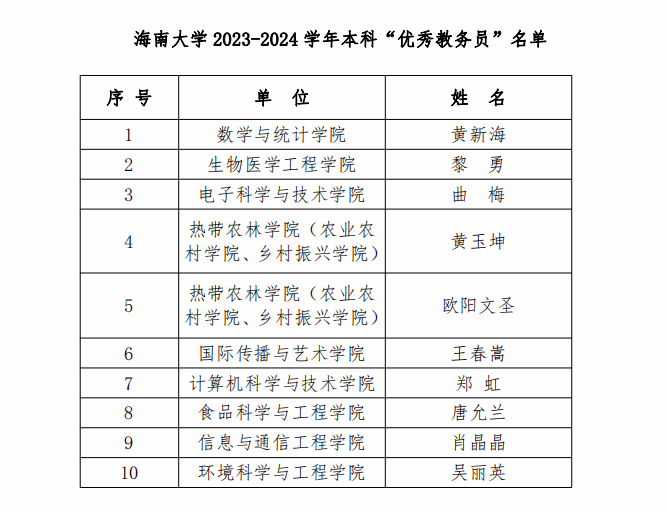 近日,在学校教务处发布《黑料 2023-2024学年本科“优秀教务员”评选结果公示》中,黑料 教研办黎勇老师凭借其出色的工作表现和卓越的教学管理能力,荣获“优秀教务员”称号。