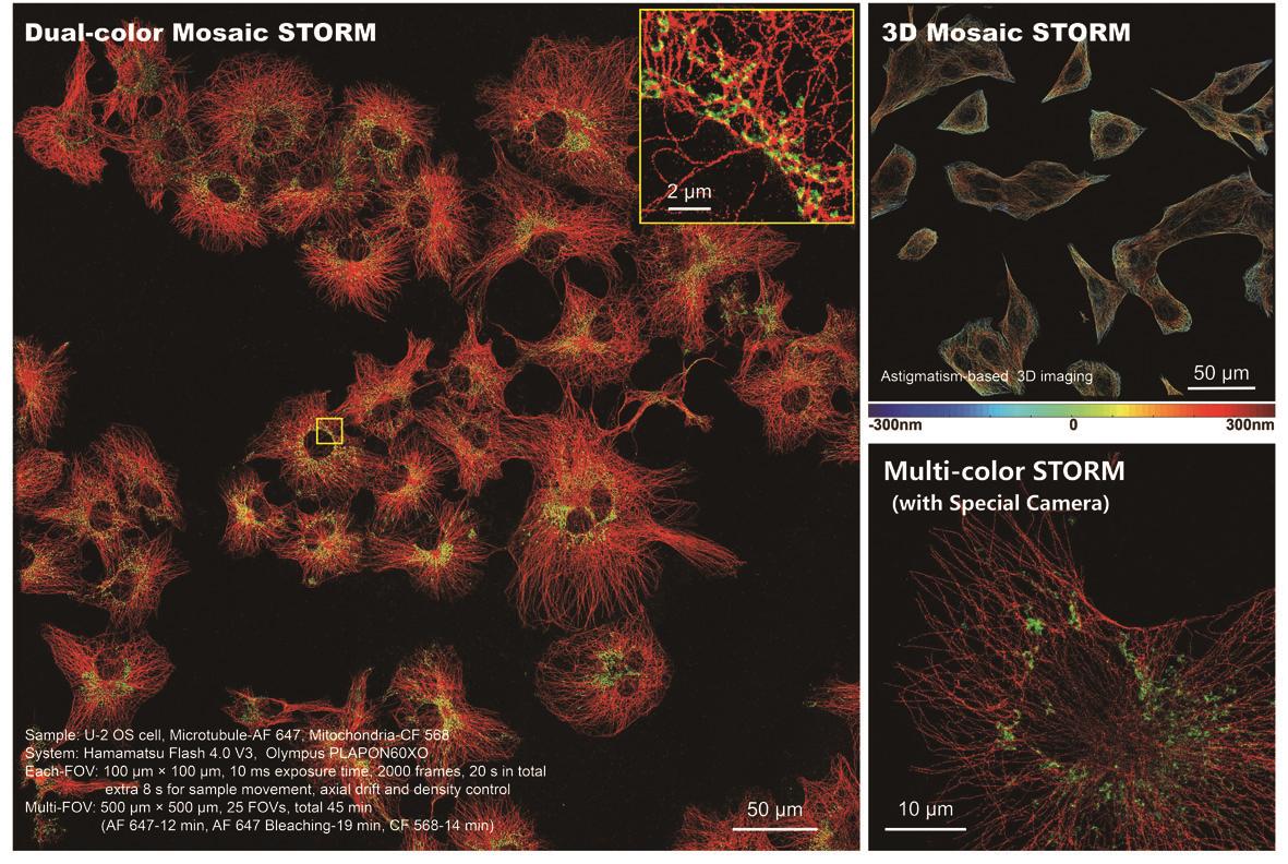 ◆ 研制了大视场超分辨定位成像技术体系和仪器样机,突破了成像视场小、数据处理时间长的瓶颈,并初步用于跨尺度细胞功能可视化。