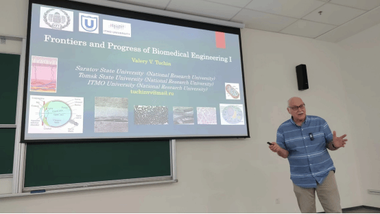 Tuchin教授是俄罗斯科学院院士,现任俄罗斯萨拉托夫国立大学教授,光学和生物光子学系主任,科学医学中心主任。他是国际上最早开展国际生物医学光子学研究、并仍然活跃于该领域的杰出代表,国际光学工程学会与美国光学工程学会的会士(SPIE/OSA Fellow)。2007年获得SPIE教育家奖,2016年获得OSA/SPIE专著奖,2019年获得OSA生物光子学奖。主要研究领域涉及生物与医学物理学、生物光子学、组织光学、医学光谱与成像、激光与光学系统中的非线动力学、光学与激光测量等。本次来访期间,Tuchin教授给学院研究生讲授了2个学时《生物医学工程前沿进展》和4个学时《生物医学传感进展》课程,并就生物医学光子学实验平台搭建、科研项目合作、共同培养博士后等议题与学院相关老师进行了深入研讨。