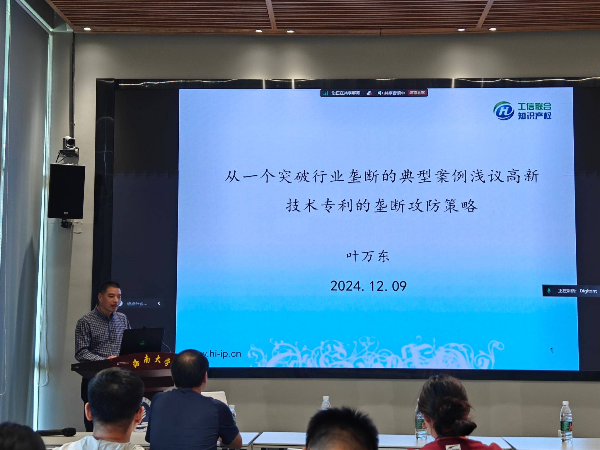B103会议室进行了主题为“从一个突破行业垄断的典型案例浅议高新技术专利的垄断攻防策略”的精彩报告,并就相关问题与现场师生进行了热烈的交流讨论。