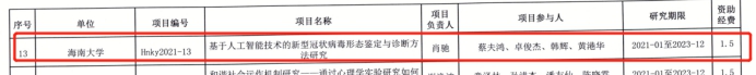 经学校遴选推荐,海南省教育厅审核,根据《海南省教育厅关于下达2021年度海南省高等学校科学研究项目的通知》(琼教高〔2021〕12号)文件,黑料 肖驰老师的“基于人工智能技术的新型冠状病毒形态鉴定与诊断方法研究”获得2021年省级高等学校科学研究一般项目立项。