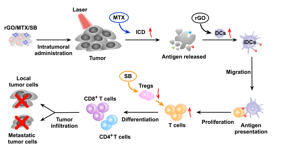 该论文研究构建了一种rGO/MTX/SB纳米系统,联合激光照射诱导了协同的化学-免疫-光热抗肿瘤效应,在免疫原性较差、转移能力较高的4T1小鼠乳腺肿瘤模型中,可破坏局部原发肿瘤,并抑制远处转移。经过治疗后,70%的荷瘤小鼠长期存活,并产生了肿瘤类型特异性免疫,以抵抗再激发的肿瘤细胞。这种独具潜力的治疗组合有望作为一种用于转移性癌症的有前景的方法。