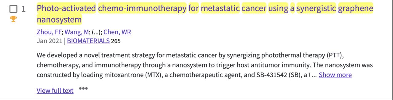 为第一单位,周非凡教授为第一作者及通讯作者, 2021年1月发表的学术论文“Photo-activated chemo-immunotherapy for metastatic cancer using a synergistic graphene nanosystem”成功入选全球前1% ESI高被引论文。该论文在国际顶级(Top)期刊《Biomaterials》(IF=12.479,中科院分区工程技术1区)发表。