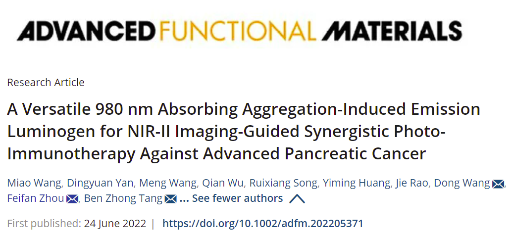 周非凡教授和深圳大学唐本忠院士、王东教授合作开发了一种新的胰腺癌治疗策略,利用具有聚集诱导发射倾向的980 nm吸收剂,实现了胰腺原位深层成像和光热-免疫联合治疗,有效靶向杀伤原位肿瘤并诱导免疫效应抑制肿瘤转移。相关研究成果以“A Versatile 980 nm Absorbing Aggregation-Induced Emission Luminogen for NIR-II Imaging-Guided Synergistic Photo-Immunotherapy Against Advanced Pancreatic Cancer”为题发表在《Advanced Functional Materials》(IF=19.924)。