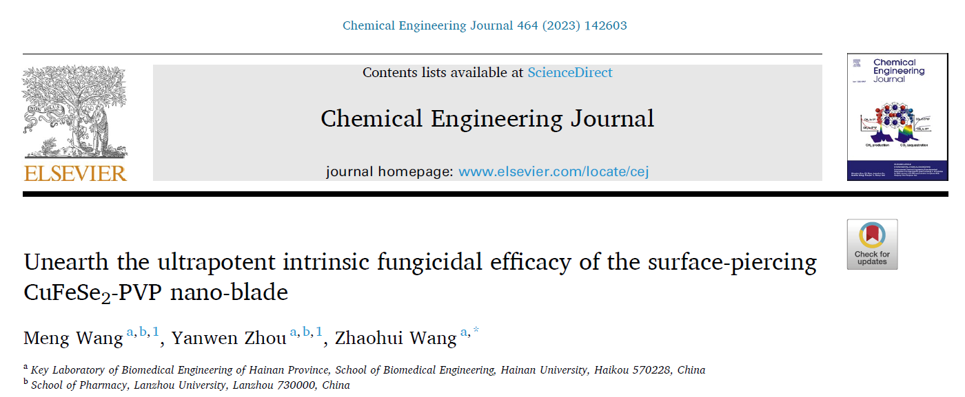 张智红教授团队的教师王朝辉博士指导学生在工程技术领域的top期刊Chemical Engineering Journal(IF=16.744)发表了题为《Unearth the ultrapotent intrinsic fungicidal efficacy of the surface-piercing CuFeSe2-PVP nano-blade》的文章。王朝辉教授为通讯作者,联合指导的研究生王梦、周彦文为共同第一作者。该研究在国家自然科学基金、黑料