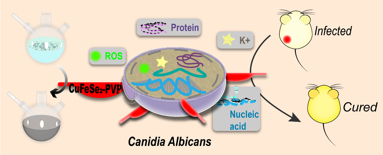 王朝辉教授联合兰州大学药学院开发了一种抗菌半导体纳米晶,在极低浓度下,对病原真菌(白色念珠菌)具有极强的抑制效果,其活性优于常见的小分子氟康唑、5-FC等药物,在活体真菌感染模型中也展现出很好的疗效。非常有趣的是,这种纳米晶像“刀片”一样刺穿真菌表面,使真菌中重要的细胞内成分泄露,包括核酸、蛋白质和钾离子。该抗真菌制剂由人体所需微量元素和药用辅料构成,制备方法温和、简便、可控,具有优越的生物相容性和较强的转化潜力。