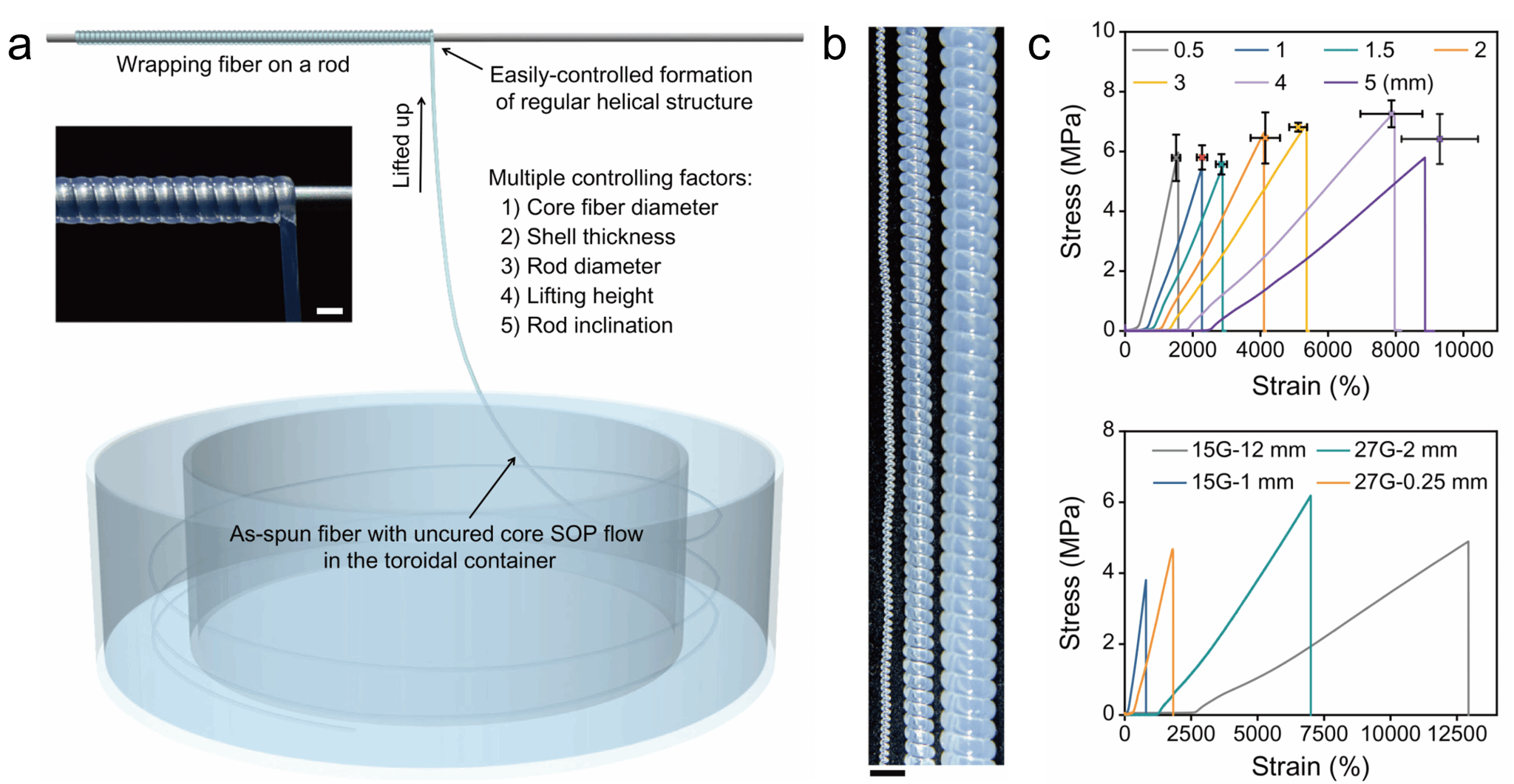同时,该技术也能够制备具有弹簧状结构的螺旋纤维。刚纺丝得到的纤维中的预聚物内核仍处于未交联状态,且受水凝胶外壳保护,因此通过一体化缠绕塑形能够制备弹性体螺旋纤维(图2)。受益于水凝胶外壳间的湿态附着现象,缠绕过程极为简便和可控,成功制备得到了尺寸大范围可控、可拉伸性优异(断裂伸长率数十至上百倍)且力学顺应的弹性体螺旋纤维,极大拓展了纤维材料的性能极限。