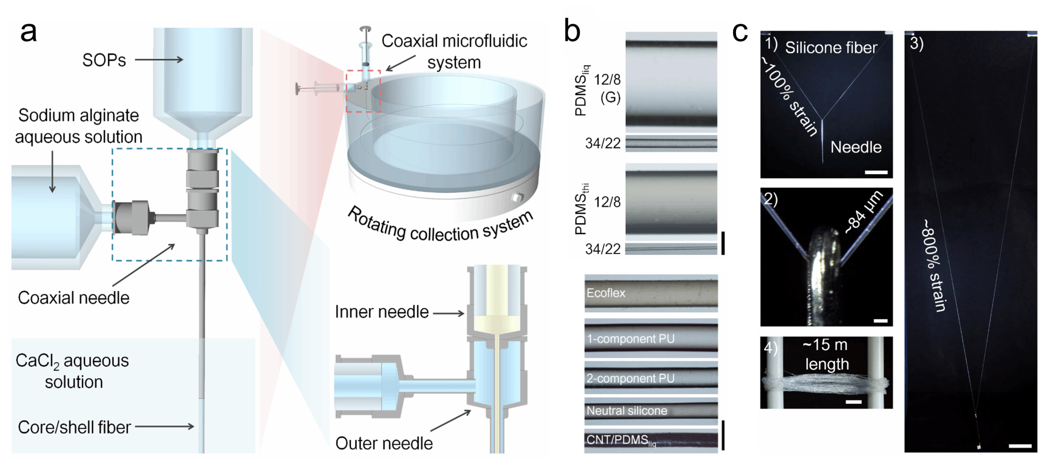 图1. (a) 水凝胶辅助的纺丝技术示意图;(b) 多种弹性体纤维照片;(c) 微米级硅胶纤维照片。