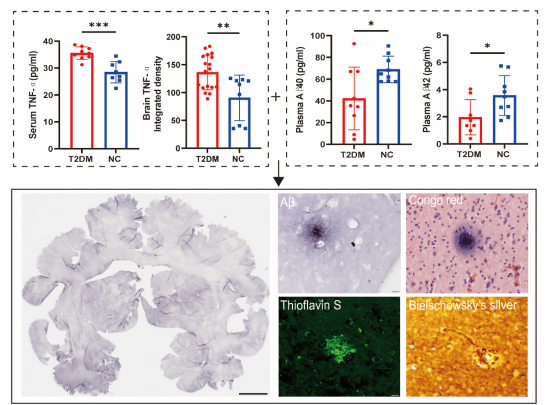 研究团队发现T2DM食蟹猴的外周和脑内炎症水平升高、体液中AD生物标志物呈异常,并在脑内观察到正在形成的不同程度的,与AD患者病理特征类似的老年斑、神经纤维缠结以及胶质细胞激活。尽管发部分突触的受损,但没有观察到神经退行性变或神经元死亡,这些证据均表明T2DM食蟹猴脑组织中的AD病理特征处于不断形成过程中的临床前状态,尚未导致突触的大量破坏以及神经元的变性死亡,而后者是导致认知记忆障碍的病理解剖基础。该模型体系为AD临床前更早期的机制与预测研究提供了一个新的视角。
