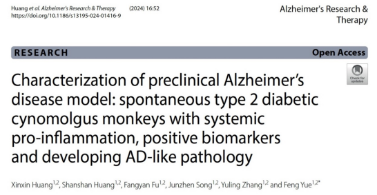 岳峰教授课题组在《Alzheimer's Research & Therapy》(中科院1区神经科学领域Top期刊,IF: 9.0)在线发表题为“Characterization of preclinical Alzheimer's disease model: spontaneous type 2 diabetic cynomolgus monkeys with systemic pro-inflammation, positive biomarkers and developing AD-like pathology”的研究成果。