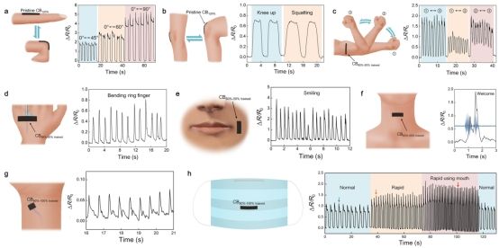 图4. 基于CBs的WSSs对人体全范围应变信号的可穿戴监测应用表现。