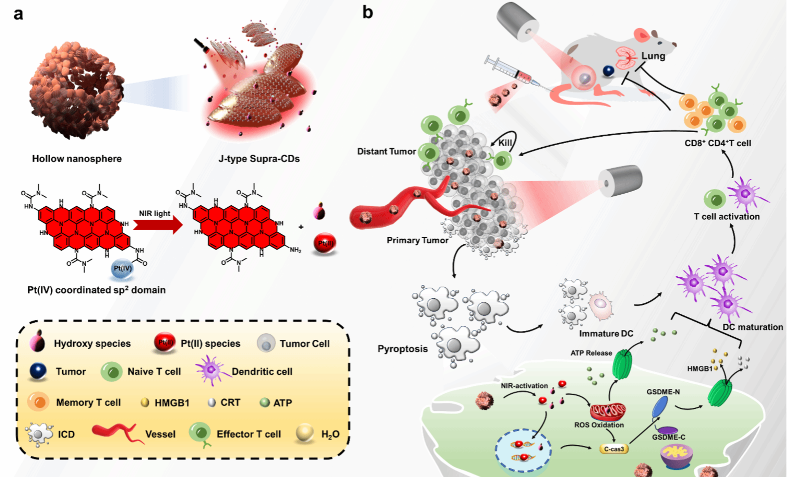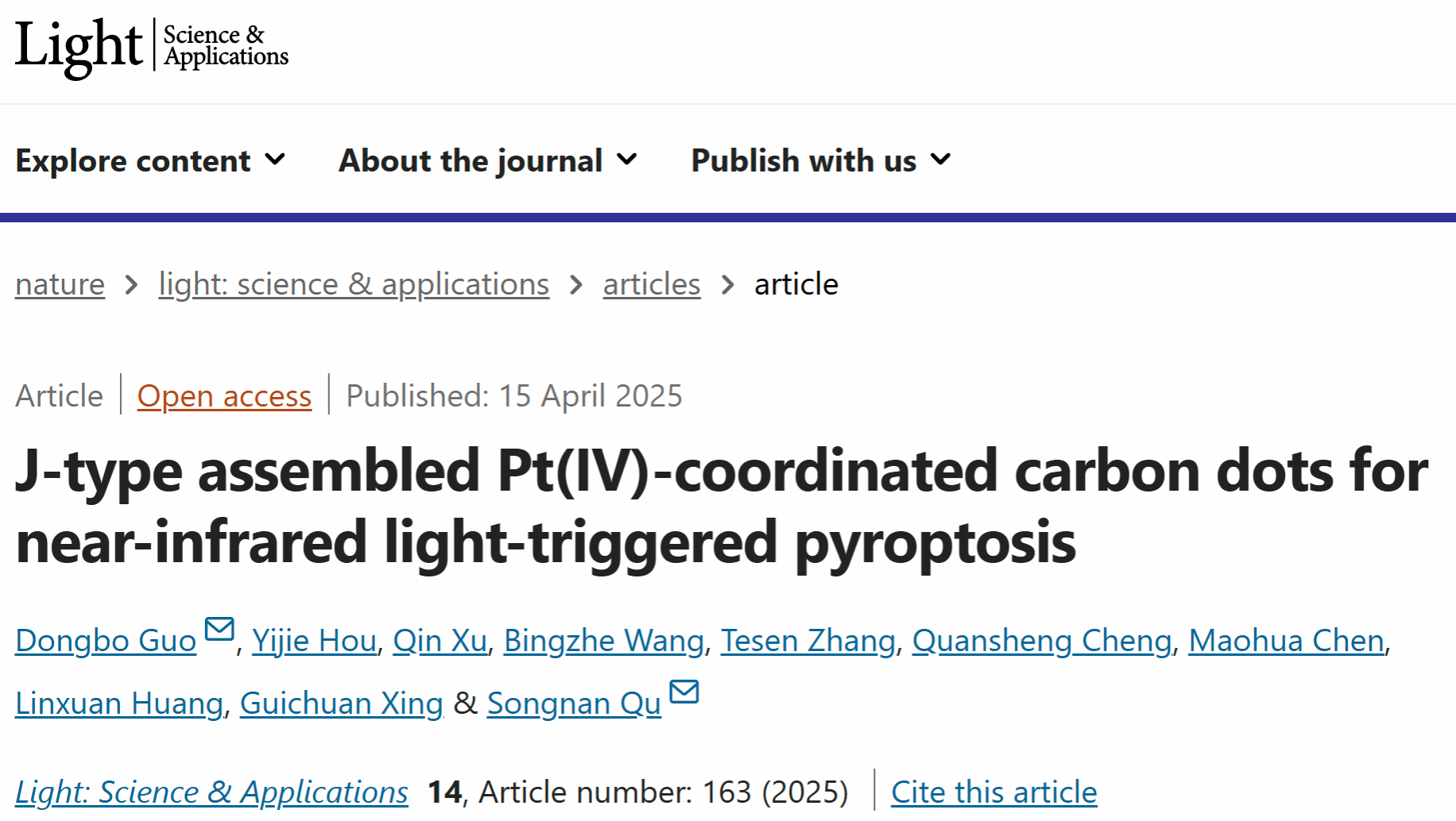 郭东波副教授在光学顶级期刊《Light: Science and Applications》(Nature子刊,中科院一区Top期刊,影响因子20.6)发表题为“J-Type Assembled Pt(lV)-Coordinated Carbon Dots for Near Infrared Light-Triggered Pyroptosis”的第一单位研究论文。